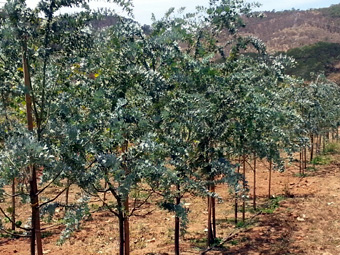 De rápido crecimiento y se mantiene verde todo el año. Llega a medir entre 6 y 10 metros de altura y un gran follaje